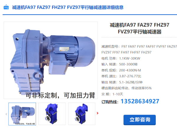 在一些用戶的減速機選型或總是在采購的過程中,有的時候往往不知道自己拿到的型號是什么意思。所以在轉(zhuǎn)交給上司以及在過程中,如果不理解這個型號的含義的話,是很容易出現(xiàn)錯誤。那么接下來就來看看這些看似很長的減速機電機型號是什么意思。今天分享的是一款平行軸斜齒輪減速機型號,來看看每個字母的含義是什么,以及這個數(shù)字所表示的實際的一些意義。比如類似的型號還有F97平行軸斜齒輪減速機,F(xiàn)F97減速器,減速機FA97,F(xiàn)AF97減速箱等等。今天分享的減速機型號是FHZ97-89.85-YVP132L-4-5.5KW-M2-R