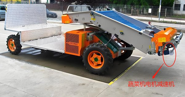 小型多功能綠葉類蔬菜收獲機(jī),用于收割蔬菜特別是空心菜等綠葉類蔬菜,其由機(jī)架、采摘裝置、減速機(jī)傳動(dòng)裝置、輸送裝置及收集裝置組成,機(jī)架上安裝有一驅(qū)動(dòng)主軸,驅(qū)動(dòng)主軸用于導(dǎo)入蔬菜收割的動(dòng)力源,驅(qū)動(dòng)主軸通過(guò)傳動(dòng)裝置與采摘裝置連接,采摘裝置安裝在機(jī)架的最前端,輸送裝置安裝在機(jī)架中部,傳動(dòng)裝置由若干鏈條與帶輪組成,傳動(dòng)裝置與輸送裝置連接,收集裝置安裝在機(jī)架的尾端且位于傳動(dòng)裝置末端的下方。機(jī)架用于提供安裝其他部件的載體,機(jī)架由不銹鋼或其他金屬材料制成,機(jī)架為架體式結(jié)構(gòu),機(jī)架包括主架、支撐架及收割支架,主架的一側(cè)設(shè)置有一牽引裝置,通過(guò)牽引裝置能夠?qū)⒄w機(jī)架與拖拉機(jī)側(cè)面進(jìn)行連接,從而驅(qū)動(dòng)立式減速機(jī)帶動(dòng)收獲機(jī)行走,驅(qū)動(dòng)主軸安裝在主架的頂端,支撐架安裝在主架的尾部,支撐架用于承載放置收集裝置,支撐架的底端安裝有一行走輪,通過(guò)行走輪可以協(xié)助機(jī)架的行走;收割支架安裝在主架的前端,收割支架用于采摘裝置 ;在收獲機(jī)進(jìn)行作業(yè)時(shí),由拖拉機(jī)通過(guò)牽引裝置帶動(dòng)收獲機(jī)前進(jìn),動(dòng)力源經(jīng)過(guò)驅(qū)動(dòng)主軸傳入到傳動(dòng)裝置,接著驅(qū)動(dòng)主軸分兩路使用鏈傳動(dòng)進(jìn)行動(dòng)力傳輸﹔與傳動(dòng)裝置的一帶輪相連接的偏心輪在鏈條傳動(dòng)的作用下進(jìn)行回轉(zhuǎn),帶動(dòng)擺線齒輪減速機(jī)驅(qū)動(dòng)連桿產(chǎn)生周期性擺動(dòng),進(jìn)而驅(qū)動(dòng)拉桿進(jìn)行往復(fù)伸縮,使得傳動(dòng)連桿拉動(dòng)撥叉擺動(dòng),撥叉與搖桿通過(guò)中間連桿連接,因而搖桿產(chǎn)生搖擺動(dòng)作,帶動(dòng)驅(qū)動(dòng)滑塊沿滑槽往復(fù)移動(dòng),最終通過(guò)刀具切割器拉桿拉動(dòng)刀具切割組件產(chǎn)生橫向剪切作用,使得蔬菜得到切割,被切割后的空心菜經(jīng)輸送帶運(yùn)送到收集箱,適時(shí)卸出。這是用戶的裝置使用電機(jī)減速機(jī)的一些情況。