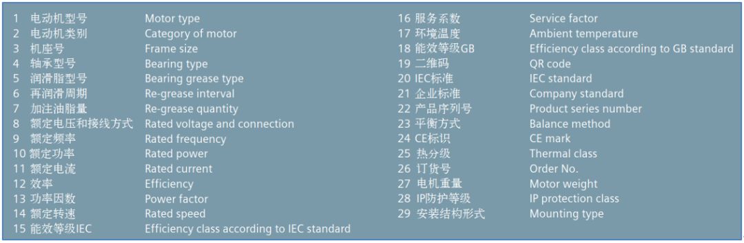 注:并不是每臺1LE0的電機銘牌都包含圖1銘牌中包含的所有數(shù)據(jù),例如,只有可再潤滑的電機銘牌才會體現(xiàn)5、6、7這三項跟潤滑脂相關的數(shù)據(jù),而永久潤滑的電機則沒有。