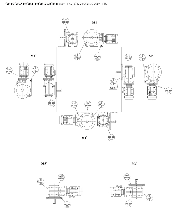 M6—電機水平放置;當減速機在M1安裝位置時,從電機方向看,減速機的左面旋轉到上方位置。